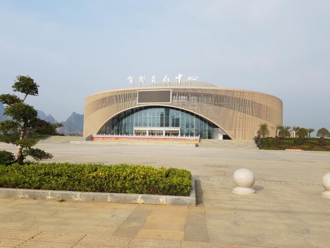 贺州市文化中心建设项目位于城东新区太白东路旁,整个建筑形体呈正圆形。项目开工时间为2012年2月3日,项目计划总投资31300万元,设计高度23.8m,总建筑面积33621㎡,占地117.7亩。建设内容为局部地下二层及地上五层建筑,内含1355个座位大剧院,影院、音乐厅、学术报告厅、会议室等8个功能厅,以及公共服务、车库用房,室外台座,290个车位生态停车场及绿化工程等。