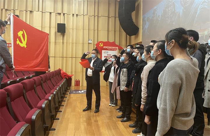 观影前,面向鲜红的党旗,城投实业党支部副书记聂茂良带领全体党员干部职工重温入党誓词。